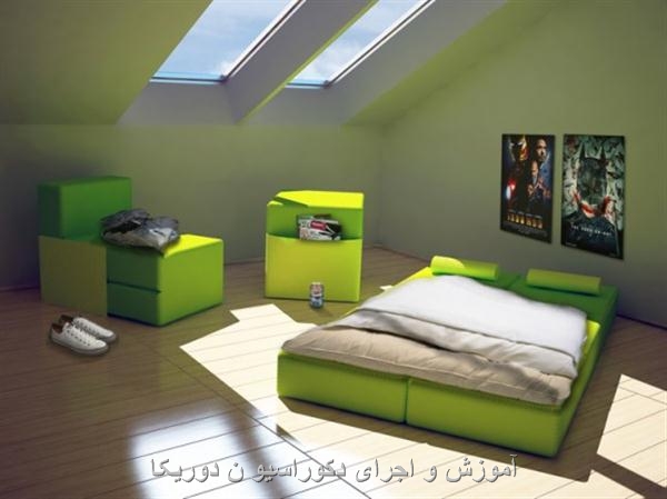 دیوارهای این اتاق به رنگ مه نقاشی شده اند . طراح این اتاق در اصل دوست دارد که این اتاق خواب در گرینویچ باشد .