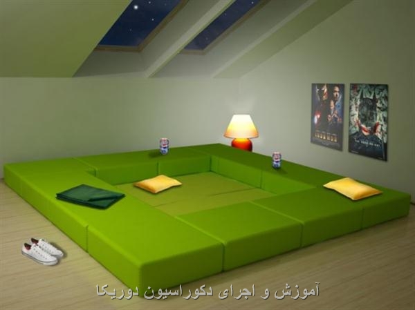من از وسایلهای سنتی در اطراف این تخت استفاده کردم . کوسن هایی که روی تخت قرار دارند با قالیچه ی کف اتاق از نظر طرح هماهنگی ایجاد کرده است .