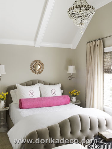 خانم ها با این رنگ احساس راحتی بیشتری دارند و همچنین این رنگ احساس عاشقانه را افزایش میدهد . در واقع در این اتاق خواب یک دکور قدیمی به رنگ صورتی قرار دارد .