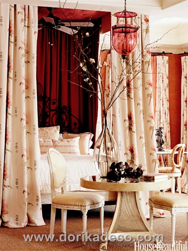 تاجهای تخت قرمز که در سان فرانسیسکو , کالیفرنیا در اتاقهای مستر استفاده میشود بسیار بزرگ و عجیب هستند . برای آنکه اتاق بیش از حد کوچک جلوه نکند طراح پرده های همرنگ دیوار با نوارهای مشکی دور آن و با یک زیر پرده ای کرم رنگ استفاده کرده است .